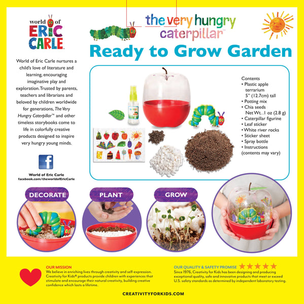 Apple shaped terrarium comes ready to decorate, plant and grow! Build creative confidence and engage with “The Very Hungry Caterpillar” classic story while you nurture your own kids terrarium Kids garden kit comes with a plastic apple terrarium, potting mix, chia seeds, caterpillar figurine, leaf sticker, white river rocks, sticker sheet, spray bottle and instructions Quick grow chia seeds mean a green thumb for everyone! This kids garden includes 2 plant grow cycles of quick grow chia seeds that will sprout within 3 to 5 days of planting Fun STEM activity for kids! Growing your own plant is a great STEM activity to learn about plant life cycles, responsibility, and nurturing World of Eric Carle nurtures a child’s love of literature and learning! Ready to Grow Garden craft allows the classic children’s book to come to life in a colorfully creative craft kit designed to inspire hungry minds Build creative confidence in your child with Creativity for Kids crafts for kids. Since 1976, we