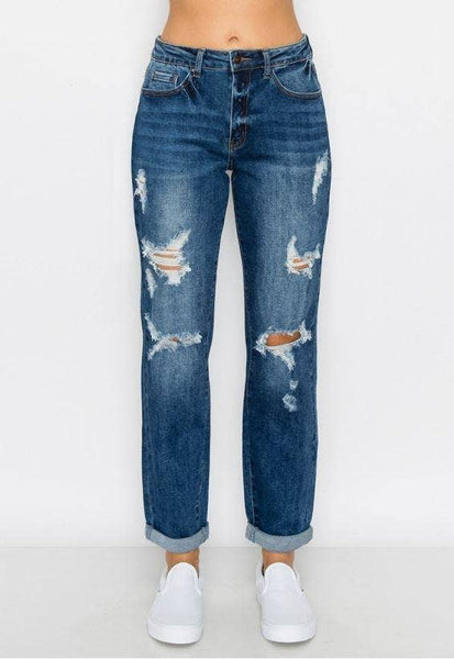 Destructed Blown Knee Rolled Cuff Boyfriend Jean in 11.1 oz stretch denim fabric Traditional 5 pocket construction with rolled cuff detail and one button and zipper closure. - 27: Inseam - 10.5" Front Rise - 12.5" Leg Opening 93% COTTON, 5% POLYESTER, 2% SPANDEX MODEL HEIGHT 5'9" CH35209