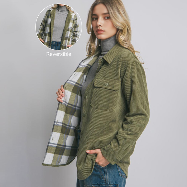 ***Image usage is allowed to the buyers who purchase from us via Faire only. 0707 Corduroy Reversible Button Down Jacket SI-26655 Material: 90% POLYESTER, 10% NYLON FEATURES: - Front Pockets, Long Sleeve & Button Down Closure * 2- In 1 Jacket, The Reversible Part Has Pockets & Different Design * SIZE + FIT - Model is 5'9", Wearing Size Small SI-26655 Corduroy Reversible Button Down Jacket (90% POLYESTER, 10% NYLON) BLACK-171163 CREAM-171164 BLUE STONE-171166 BROWN-185031 BURGUNDY-185032 OLIVE-185033