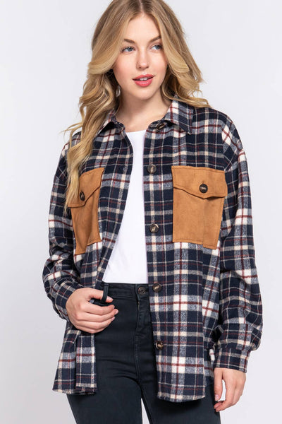 SUEDE POCKET BRUSHED PLAID SHACKET Fabric Content: 95% POLYESTER 5% WOOL Long sleeve shacke